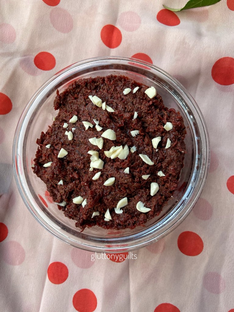 While I topped the beetroot halwa with cashews and green cardamom powder, and gobbled down on it, I realized the utter uselessness of cooking it because beetroot is such an obnoxiously stubborn vegetable that refuses to change its colour and taste, and only softens it texture. Nonetheless, it tastes good!